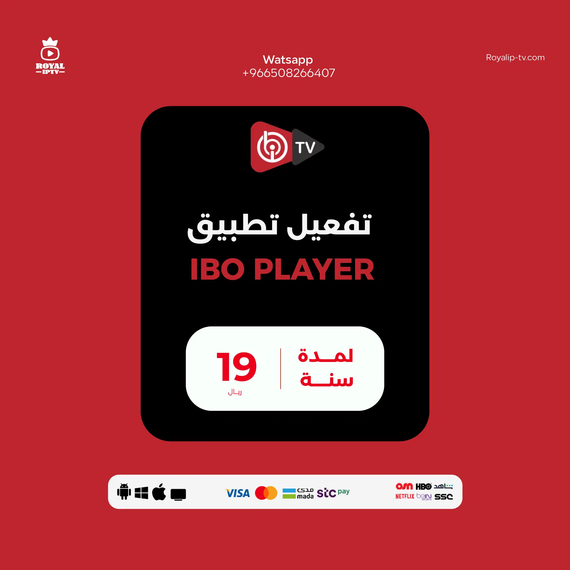 يمكنك ايضا التواصل معنا عبر ايقونة الواتس اب وتفعيل تطبيق IBO PLAYER لمدة سنة والحصول على الكثير من الباقات والاشتراكات اشتراك MYHD IPTV، اشتراك تيرا TERA TV 4K من خلال اكبر متجر اشتراكات Royal IPTV.